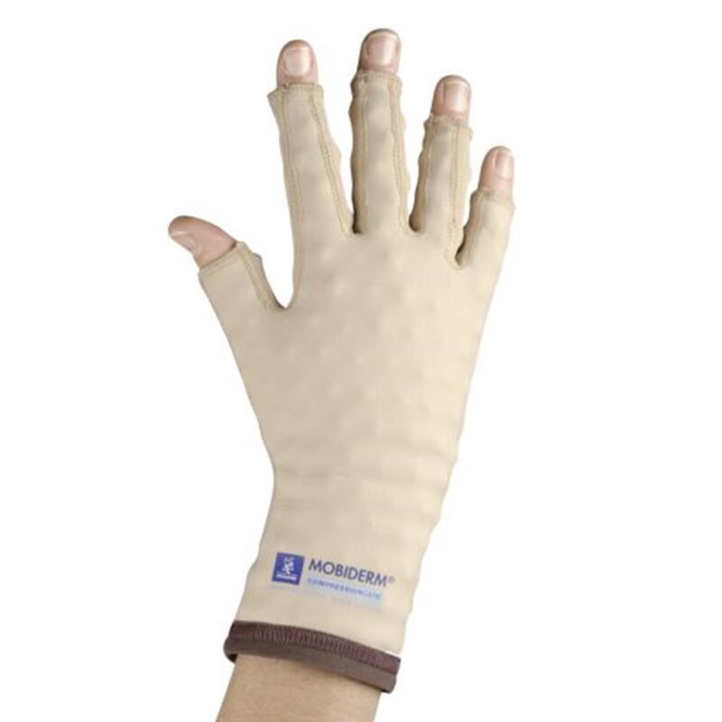 Il guanto con dita Mobiderm è progettato per facilitare la gestione della fase di mantenimento nel trattamento del linfedema delle dita e della mano rispetto ai trattamenti tradizionali di autobendaggio, applicando una compressione di 10mmHg.